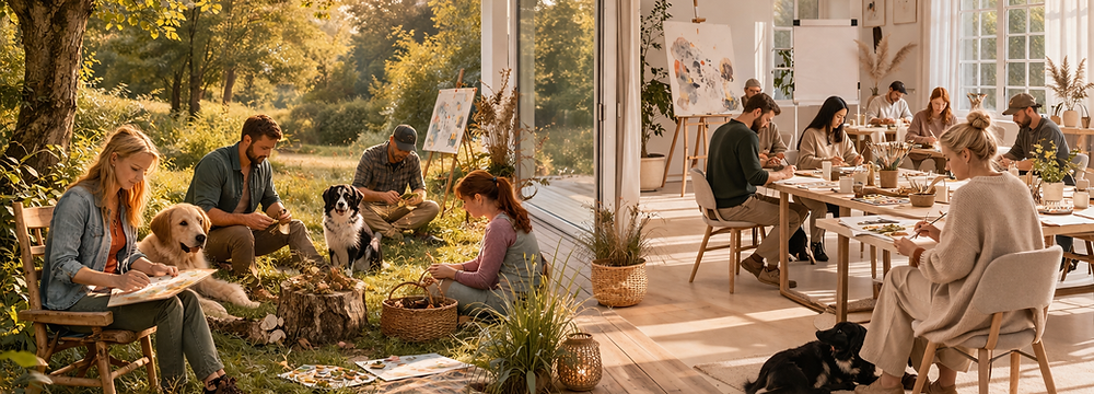 Workshop: Kunst Natur Hund Kreativer Workshop & Coaching mit deinem Hund Leitung: Fenja – Künstlerin & Hund-Mensch-Coach Dauer: 11:00– ca.16:30 Uhr (6 Stunden inkl. Pausen) Teilnahmegebühr: 89 € inkl. +10€ Material (Materialien wie Farben, Naturmaterialien und Werkzeuge werden gestellt. Du darfst gerne eigene Materialien mitbringen – bitte extra kennzeichnen. Jeder Teilnehmerin erhält eine Leinwand oder optional Holz als Untergrund.) Ort: Hundezentrum Fenjas Art – Wald, Natur-Wiese & geschützter Seminarraum Worum geht’s? Dieser Workshop verbindet Kunst, Natur, Coaching und "EINFACH MACHEN" . Du entdeckst, wie dein Ausdruck über Farben, Naturmaterialien und Collagen zu einem Spiegel deiner inneren Wahrnehmung wird. Wir arbeiten draußen in der Natur und im geschützten Seminarraum, sammeln Materialien wie Steine, Holz oder Blätter und gestalten daraus dein persönliches Kunstwerk. Was dich erwartet: Ankommen & Impulse zur Verbindung mit dir, der Natur & Hunden Natur erleben und Materialien & Ideen sammeln Kreatives Gestalten im Seminarraum mit Farben& Naturmaterialien Raum für Ruhe, Reflexion und persönlichen Ausdruck/Loslassen Für wen geeignet: Alle, die sich selbst und ihre "Einfach-mal-machen" Verbindung bewusster wahrnehmen wollen Hundebesitzer*innen und Hundefreunde ohne eigenen Hund ~Du brauchst keine Vorkenntnisse – nur Lust auf Natur, Ausdruck und eine besondere Auszeit. Was du mitbringen solltest: Eine Kleinigkeit fürs gemeinsame Picknick/ Snackpause Naturgemäße Kleidung Deinen Hund (unter deiner Aufsicht) –Die Teilnahme ist auch ohne Hund möglich Umgang mit Hund im Workshop: Der Workshop ist kein Hundetraining – der Fokus liegt auf dir und deiner kreativen Gestaltung Dein Hund bleibt durchgehend unter deiner Aufsicht und ist nicht frei laufend Pinkel- und Bewegungsrunden gestaltest du eigenverantwortlich und nach Bedarf Maulkorb, falls dein Hund ihn in Gruppen benötigt Rücksprache, falls dein Hund ausgeprägtes Bellverhalten zeigt Ggf. Schleppleine, Decke, Wasser – alles, was dein Hund zur Ruhe braucht Wir sorgen für entspannte Übergänge, Rückzugsmöglichkeiten und achtsames Miteinander -Gemeinsames Ankommen -Einstieg & Austausch zur Bildidee - Begleitung durch Fenja – Impulse & kreative Unterstützung -Raum für künstlerischen Flow & Ruhe -Abschlussrunde mit Bildpräsentation & persönlichem Rückblick Du nimmst dein persönliches Natur/(Bunt)-Werk mit nach Hause ~ Ausdruck deiner Wahrnehmung Anmeldung: bitte spätestens 7 Tage vor Beginn.